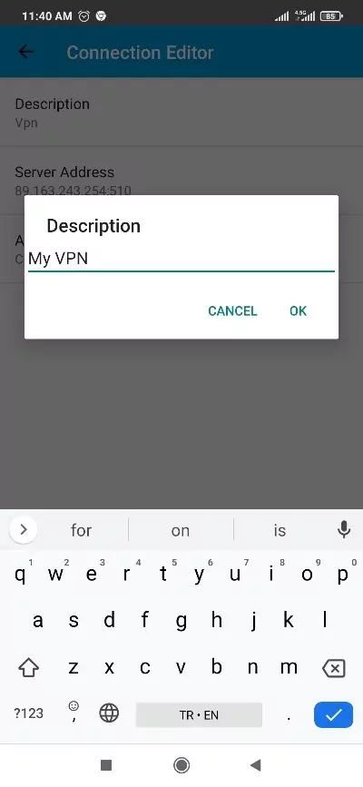 - Tap Description and Enter a name for your connection, then tap ok.