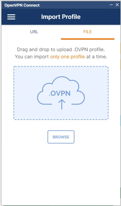 In the OpenVPN Connect, go to the File tab click on BROWSE find the .ovpn file you received in your email, and import it. Then on the next page, enter the Username and Password of the profile and press the CONNECT button.